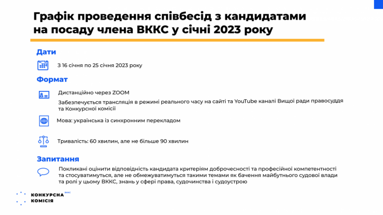 Конкурсна комісія з добору кандидатів на посаду члена Вищої кваліфікаційної комісії суддів України проведе другий етап конкурсу – співбесіду із 64 кандидатами у січні та лютому 2023 року. Комісія склала графік проведення співбесід на 16 – 25 січня 2023 року.